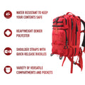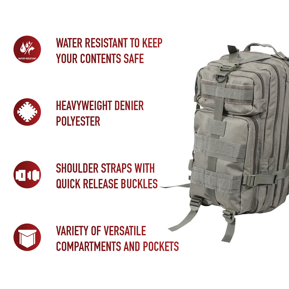 Our Medium Transport Pack features a main compartment with a zippered pouch and mesh pocket, and 3 additional zippered storage compartments, all equipped with large two-way zippers for full access to your tactical gear and outdoor supplies. The tactical backpack has a 25L capacity and measures 17 inch x 10 inch x 9 inch, providing ample storage space for EDC essentials. The military backpack is great for going to the range, trekking out into the great outdoors, or stocking up as a bug out bag.